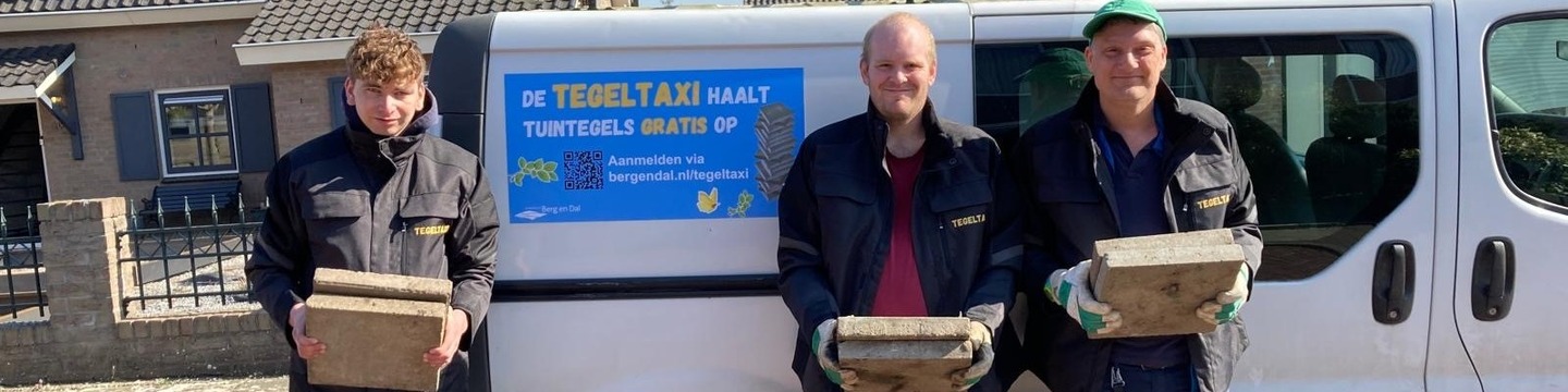 Wij komen door heel gemeente Berg en Dal gratis de tegels ophalen die je zelf uit jouw tuin verwijdert. Voorwaarde is dat je de oude tegels vervangt voor planten. We organiseren deze actie samen met het Derdebaan groenteam van Pluryn. Via deze pagina meld je je aan voor de tegeltaxi.